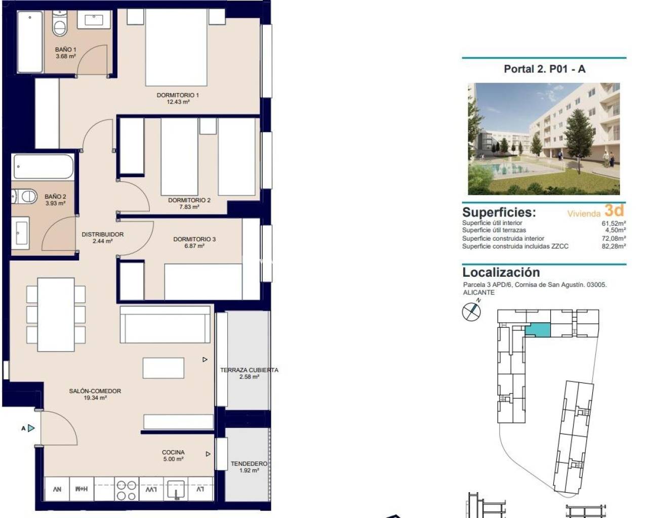 Neue Wohnsiedlung in Alicante mit offenem Blick Neu gebaute Häuser in privilegierter Lage Entdecken Sie diese exklusive neue Wohnanlage in Alicante, die ein Maximum an Komfort und Lebensqualität bieten soll. Die Anlage mit 84 Wohnungen mit 2 und 3 Schlafzimmern befindet sich in San Agustín - Pau II, einer strategisch günstigen Gegend, in der alle wichtigen Dienstleistungen leicht zu erreichen sind. Den Bewohnern steht ein modernes und funktionelles Umfeld mit großen Gartenflächen, Gemeinschaftspool, Kinderspielplatz, Parkplätzen und Abstellräumen zur Verfügung. Darüber hinaus garantiert die erhöhte Lage einen ungehinderten Blick auf die Stadt und die umliegende Natur. Dienstleistungen und Annehmlichkeiten in der Umgebung Die Wohnanlage ist von einem breiten Angebot an Dienstleistungen umgeben, die Ihnen das tägliche Leben erleichtern: Bildungszentren: Bis zu 9 Schulen und Institute in der Nähe. Supermärkte und Geschäfte: Vier große Supermärkte in der Nähe. Einkaufszentrum der Insel Korfu: Mit Geschäften, Fitnessstudios, Restaurants und einer Vielzahl von Läden. Sportanlagen: Bereiche für Bewegung und Aktivitäten im Freien. Die ausgezeichnete Infrastruktur des Viertels garantiert Komfort, Sicherheit und Zugänglichkeit und macht es zu einem idealen Ort für Familien und Investoren. Qualität und Design der Wohnungen Die Wohnungen wurden nach einem modernen und effizienten Konzept entworfen, bei dem hochwertige Materialien und nachhaltige Technologien zum Einsatz kommen: Verstärkte Zugangstür für zusätzliche Sicherheit. Klimaanlage mit Kanalisation (warm und kalt). Zimmermannsarbeiten mit thermischer Trennung und Doppelverglasung zur Verbesserung der Wärme- und Schalldämmung. Warmwasseraufbereitung mittels Aerothermie, die Energieeffizienz und Nachhaltigkeit garantiert. Eine Umgebung mit schnellem Zugang zu den wichtigsten Punkten von Interesse Das Viertel San Agustín liegt auf einer sanften Anhöhe und bietet einen Panoramablick auf die Skyline der Stadt Alicante, den Berg Benacantil und die umliegenden Berge. Das mediterrane Klima und die Nähe zu Grünflächen und Freizeiteinrichtungen machen es zu einem idealen Wohnort. Wichtige Entfernungen: Stadtzentrum von Alicante - 2 km. Flughafen Alicante-Elche - 14 km. Strand San Juan - 6 km. Golfplatz Alicante - 7 km. Hafen von Alicante - 5 km. Erleben Sie den mediterranen Lebensstil in Alicante Alicante bietet ein außergewöhnliches Klima, ein pulsierendes kulturelles Leben und eine erstklassige Infrastruktur, was sie zu einer der begehrtesten Städte Spaniens macht. Diese neue Wohnanlage in San Agustin - Pau II kombiniert elegantes Design mit einer unschlagbaren Lage. Kontaktieren Sie uns noch heute, um einen Besichtigungstermin zu vereinbaren und Ihr neues Zuhause in Alicante zu entdecken.