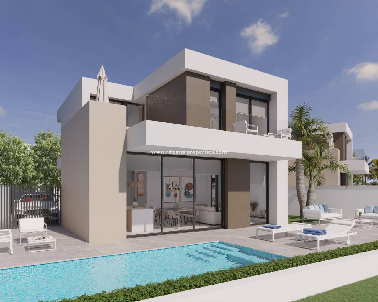 Neubau-Villen in erster Reihe am Roda Golf mit privatem Pool Exklusives Wohnen am Golfplatz an der Costa Cálida Diese modernen Villen in erster Reihe in Roda Golf (Murcia) bieten die perfekte Mischung aus Luxus, Komfort und mediterranem Lebensstil. Nur 3 km von den goldenen Stränden des Mar Menor entfernt, ist dieses Wohnprojekt ideal für Golfliebhaber, Wassersportler und diejenigen, die ein ruhiges und dennoch gut angebundenes Zuhause an der Costa Cálida suchen. Die Anlage ist umgeben von Dienstleistungen, Restaurants, Einkaufsmöglichkeiten und Sportanlagen, die den Komfort des täglichen Lebens gewährleisten. Geräumige Villen mit privaten Pools Jede Villa ist durchdacht auf zwei Ebenen mit einer Gesamtfläche von 140 m² angelegt. Der Grundriss umfasst: 3 Schlafzimmer (2 mit eigenem Bad) 3 voll ausgestattete Badezimmer Helles Wohnzimmer mit offener Küche Schlafzimmer im Erdgeschoss für mehr Komfort Zwei Schlafzimmer im ersten Stock mit direktem Zugang zur überdachten Terrasse Genießen Sie das Leben im Freien mit einem privaten Swimmingpool, einer großzügigen Terrasse im Erdgeschoss und einer Sonnenterrasse im ersten Stock, die einen unverbauten Blick auf den Golfplatz und den ganzen Tag Sonne bietet. Zu jeder Immobilie gehören außerdem ein privater Parkplatz auf dem Grundstück und ein großer Außenabstellraum. Hochwertige Ausstattung Diese Häuser sind nach den höchsten Standards gebaut und verfügen über: Fußbodenheizung in den Badezimmern Motorisierte Aluminiumrollläden in allen Schlafzimmern Komplett ausgestattete Badezimmer mit Möbeln, Spiegeln, Beleuchtung und Duschwänden aus Glas Moderne Küchen mit Geräten Vorinstallation für eine Klimaanlage im Wohnzimmer und in den Schlafzimmern Solarzellen mit Wechselrichter für Energieeffizienz Erstklassige Lage in Roda Golf Diese Villen befinden sich im prestigeträchtigen Roda Golf & Beach Resort und sind von üppigen Fairways und mediterranen Landschaften umgeben. Entfernungen zu den wichtigsten Sehenswürdigkeiten: Strände von Mar Menor: 3 km Einkaufszentrum Dos Mares: 5 km Yachthafen Lo Pagán: 6 km Roda Golf Clubhaus: zu Fuß erreichbar Internationaler Flughafen Murcia (Corvera): 35 km Flughafen Alicante: 85 km Stadt Cartagena: 30 km Leben Sie den mediterranen Lebensstil Ob als Dauerwohnsitz, Urlaubsdomizil oder Mietinvestition – diese Villen bieten die perfekte Kombination aus Eleganz, Funktionalität und Lage. Kontaktieren Sie uns noch heute, um einen Besichtigungstermin zu vereinbaren und sich Ihre Villa in erster Reihe im Roda Golf zu sichern. Ihr Traumhaus an der Costa Cálida wartet auf Sie!