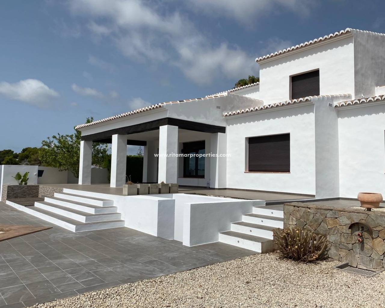 Mediterranean Style Villa with Sea Views for Sale in Moraira, Costa Blanca Elegant Villa with Panoramic Sea Views This beautiful Mediterranean-style villa for sale in Moraira (Costa Blanca, Alicante) offers breathtaking open views of Cape Moraira, the sea and the surrounding coastline. Set on a hilltop, the property enjoys total privacy and tranquility while remaining just 2 km from the vibrant center of Moraira, its golden beaches, supermarkets, restaurants and cafés. Built on a nearly flat plot of 897 m2, the villa provides exceptional comfort, beautiful outdoor spaces and stunning views from all main rooms. Spacious Layout Over Two Floors The villa is distributed over two levels designed to maximize natural light and sea views. On the ground floor, there is a bright living-dining room with a fireplace, a space ready for the installation of a modern kitchen and laundry area (pre-installed plumbing and electricity), and a complete bathroom with a shower. This floor also features a connected yet independent guest apartment with its own entrance, consisting of a living-dining area that could serve as a master suite, a bedroom, a bathroom and an additional space pre-fitted for a dressing room or en-suite bath. The apartment’s entrance showcases a beautifully restored solid wood door, adding authentic Mediterranean charm. On the upper floor, accessed by internal stairs, you will find two comfortable bedrooms, a bathroom and a large solarium terrace with spectacular sea views—perfect for relaxing or enjoying the sunset. Outdoor Living and Mediterranean Charm The villa’s exterior is designed for enjoying the Mediterranean lifestyle to the fullest, featuring spacious terraces, a uniquely shaped private pool with an outdoor shower and an easy-to-maintain garden with automatic irrigation. There is ample space for outdoor dining, sunbathing and entertaining family and friends. High Quality Features and Finishes This property offers modern comfort combined with Mediterranean character, including Aluminum carpentry with wood effect finish and double glazing Motorized blinds and mosquito nets in bedrooms Built-in wardrobes with sliding doors Central heating by radiators Adjustable interior lighting Motorized sliding vehicle gate and pedestrian access Private parking within the plot Prime Location Near Key Amenities Moraira town center and beaches: 2 km La Sella Golf Course: 15 km Port of Moraira: 2 km Shopping centers: 5 km Alicante International Airport: 90 km Experience Mediterranean Living at Its Best This exceptional villa combines privacy, elegance and stunning sea views in one of Costa Blanca’s most desirable locations. Contact us today to arrange a viewing or to request more information about this beautiful home in Moraira.