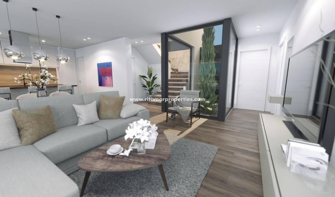 VILLAS DE OBRA NUEVA EN FINESTRAT Proyecto de obra nueva de 10 villas de diseño moderno, en un entorno natural con vistas al mar y a la montaña, cerca del campo de golf Puig Campana, y a poca distancia de las localidades de Finestrat y Benidorm. El proyecto se dividirá en dos fases de construcción, que a su vez incluyen dos tipos de viviendas, de 1 ó 2 plantas, 3 dormitorios dobles, 2 ó 3 baños completos, salón-comedor con cocina integrada, lavadero, amplia terraza y jardín, piscina privada, parking exterior, 1 ó 2 sótanos polivalentes y en algunos modelos garaje subterráneo cerrado. Posibilidad de solarium con coste adicional. Villas construidas con las mejores calidades y los últimos avances en construcción, entre otros - Barandillas de cristal que no rompen la continuidad de las vistas. - Solería de gres porcelánico de primera calidad. - Puerta de entrada blindada. - Carpintería exterior de aluminio con rotura de puente térmico y doble vidrio aislante de baja emisividad con cámara de aire y seguridad en zonas con riesgo de rotura. - Carpintería interior lisa, de madera lacada en blanco con tiradores y herrajes de acero inoxidable. - Armarios y vestidores correderos totalmente equipados. - Producción de agua caliente sanitaria mediante sistema de bomba de calor con depósito acumulador de 100L, con apoyo de placas solares en cubierta. - Instalación eléctrica de alta gama 9,2kw. - Instalación de aire acondicionado por conductos con máquinas incluidas. - Cocinas de diseño minimalista, totalmente equipadas con isla, muebles y electrodomésticos incluidos. - Piscina privada con iluminación y zona de playa con pavimento o césped artificial. - Sótano polivalente totalmente personalizable, según modelo con zona de garaje para un vehículo y preinstalación para vehículo eléctrico. Villas se encuentra en un entorno privilegiado de la Costa Blanca, en una zona elevada al pie de la sierra, rodeada de naturaleza y de otras urbanizaciones similares, con excelentes vistas al mar y sus alrededores. Muy bien comunicada por carretera con la cercana población de Finestrat, a 10 minutos en coche de los centros comerciales, la autopista A7, las playas y las cercanas poblaciones de Benidorm y Villajoyosa, y a 30 minutos de la ciudad de Alicante y su aeropuerto internacional.