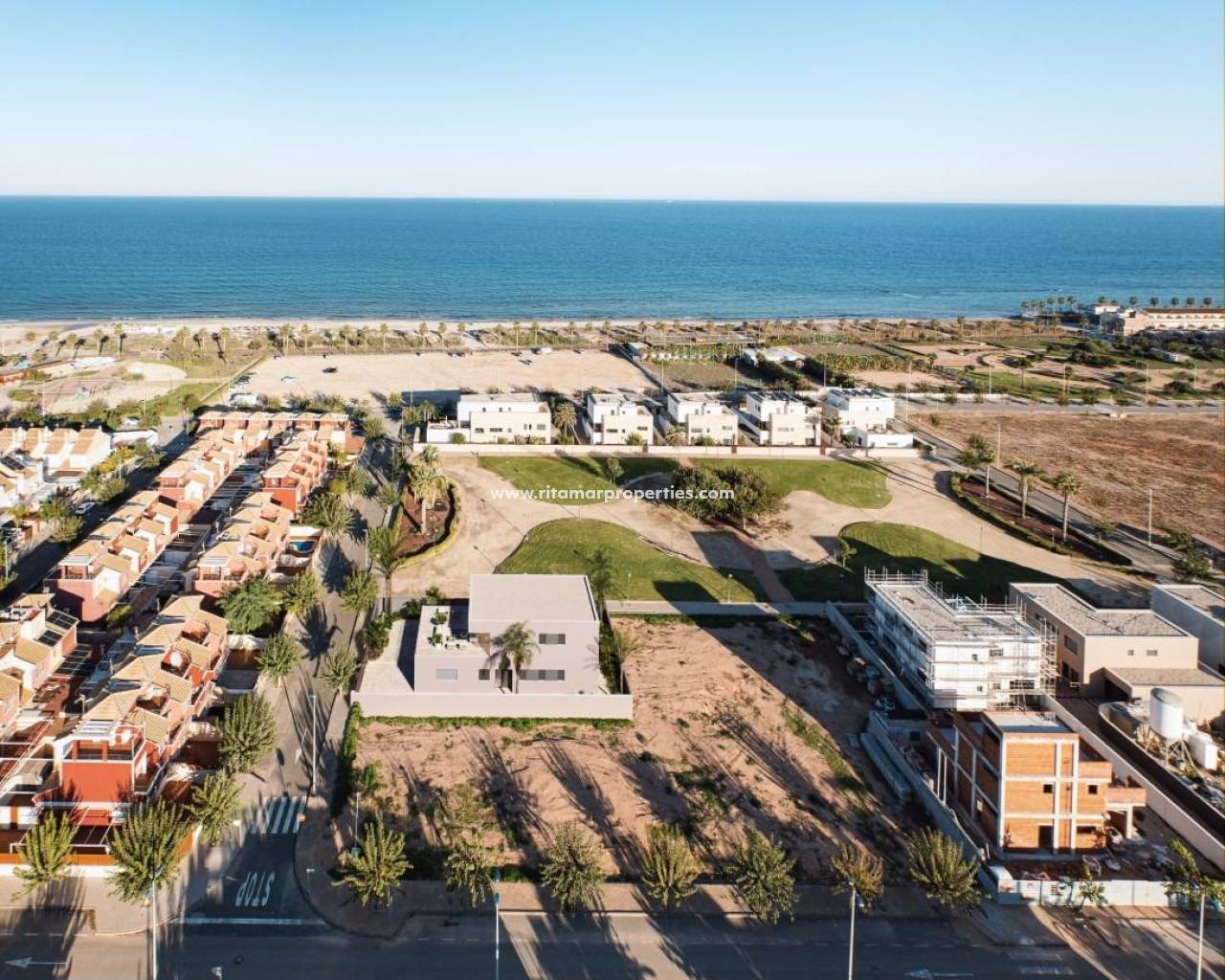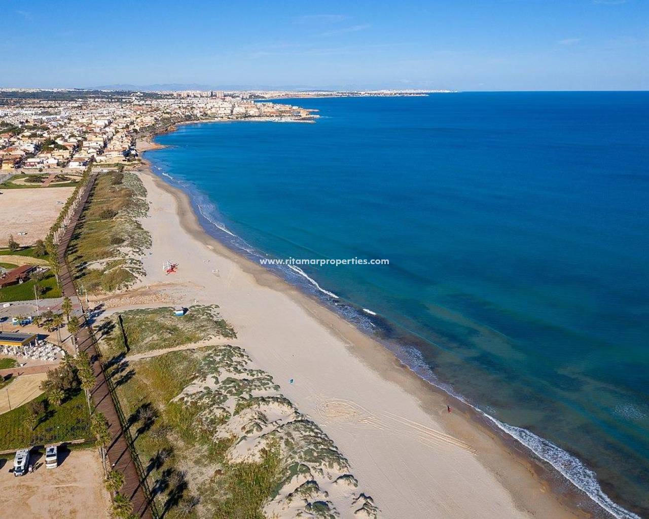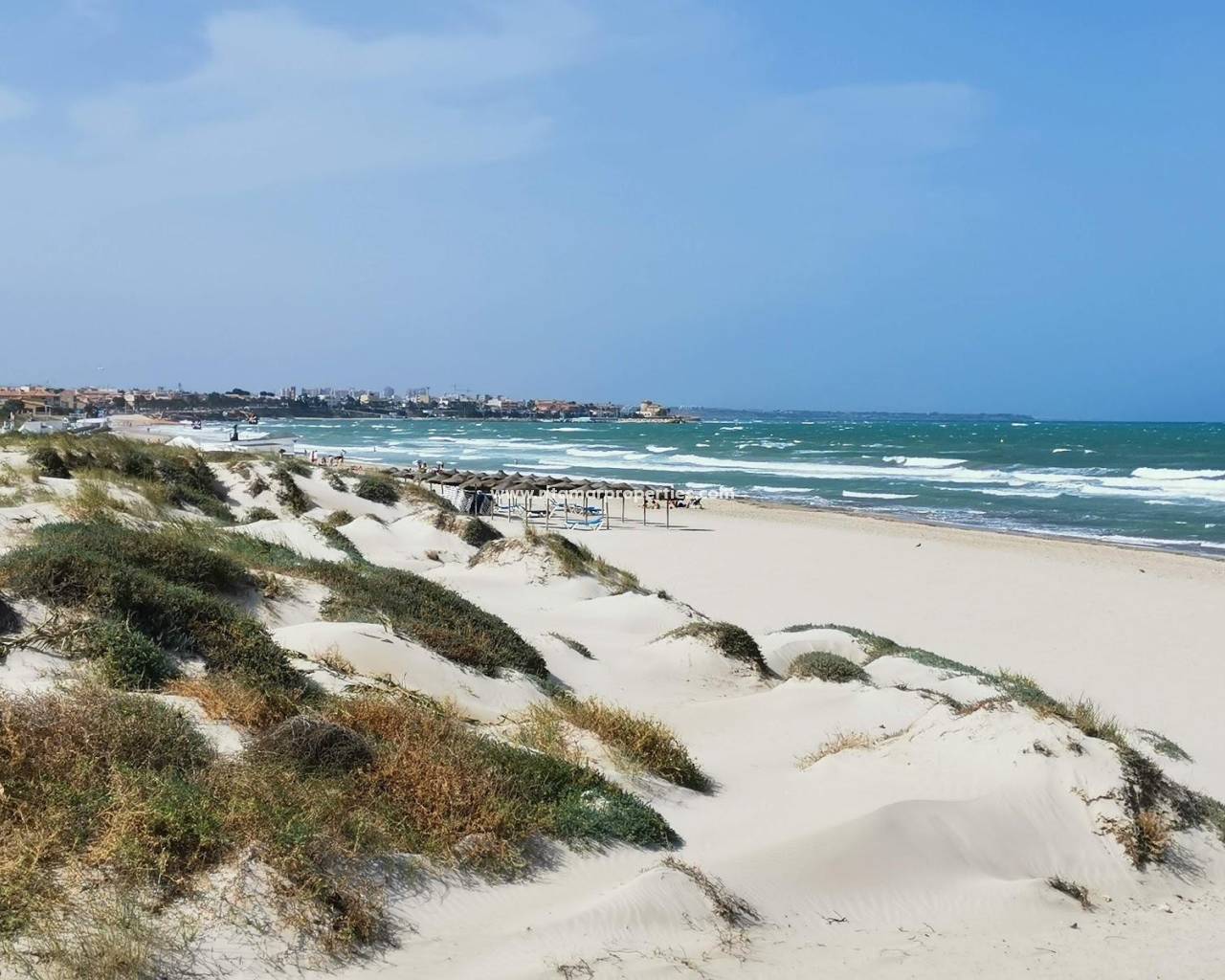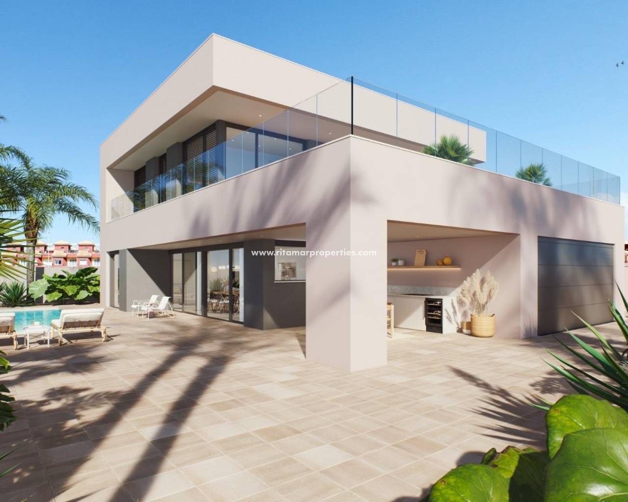 VILLA DE OBRA NUEVA EN TORRE DE LA HORADADA Moderna villat de obra nueva cerca de la playa de Higuericas en Torre de la Horadada. Villa consta de una parcela de 618 m², con 344 m² construidos. Villa dispone de 5 dormitorios: dos de ellos con baño completo y vestidor. Cocina amueblada con materiales de primera calidad a elegir por el propietario, incluyendo electrodomésticos, siguiendo un concepto abierto con el comedor rodeado de grandes ventanales que proporcionan durante todo el día una agradable luminosidad y acceso directo a la piscina y zonas ajardinadas privadas totalmente terminadas. Aire acondicionado (frío/calor) por conductos incluido. Cuidando hasta el más mínimo detalle en los acabados, utilizando materiales de la más alta calidad, diseño personalizado y lujo sin olvidar el máximo confort, conseguimos el disfrute de la vivienda tanto en verano como en el suave invierno, haciéndola habitable durante todo el año. Además de una zona de garaje cubierto para 2 vehículos y aparcamiento para otro coche. Villa situada a 100m de la playa de Higuericas, en Torre de la Horadada, un paraíso en todos los aspectos, donde podrá disfrutar de la inmensidad del Mar Mediterráneo, del paseo marítimo, de refrescantes baños en el mar, de deportes náuticos, vela, surf, snorkel y a tan solo 8 km de Lo Romero Golf, uno de los 21 campos de golf de la Costa Blanca. A 5 minutos del puerto deportivo de La Torre de la Horadada y a 10 minutos de los puertos deportivos de San Pedro del Pinatar, y de los mejores restaurantes donde disfrutar de la mejor cocina mediterránea. Sin olvidar la proximidad de la autopista AP7 que conecta nuestro residencial con dos aeropuertos con destinos internacionales, a 44 km de Corvera y a 75km de El Altet, Alicante. La población más cercana a la zona donde se ubica la promoción es Pilar de la Horadada, a 1 km, una población tranquila con todo tipo de servicios, colegios, centros de salud, policía, farmacias, etc. También hay dos zonas comerciales cercanas, el Centro Comercial Dos Mares en San Javier, a 5 minutos en coche y La Zenia Boulevard en Orihuela Costa, a 15 minutos en coche.