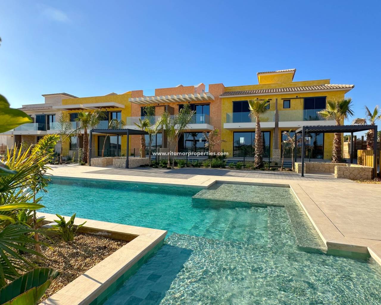 Découvrez le summum de la vie de luxe à Desert Springs. Nichées dans ce complexe exclusif, ces maisons de ville offrent un mélange exceptionnel de design moderne, de confort et d'environnement à couper le souffle. Situées autour d'une piscine privée et entourées de magnifiques jardins paysagers, ces résidences offrent des vues spectaculaires sur le terrain de cricket, les majestueuses chaînes de montagnes et le littoral méditerranéen. Chaque maison de ville présente un intérieur lumineux et contemporain, conçu pour maximiser la lumière naturelle et créer un espace de vie moderne et élégant. La propriété comprend deux chambres spacieuses, chacune avec sa propre salle de bains, un salon et une salle à manger qui s'ouvrent sur une véranda, et un solarium privé sur le toit, idéal pour se détendre tout en profitant des vues panoramiques. Au sein de cette communauté sécurisée, vous aurez accès à des jardins communs, à une piscine et à une place de parking privée, ce qui vous assurera confort et tranquillité d'esprit. Les maisons de ville disposent d'un espace de vie généreux et d'une superbe terrasse sur le toit, offrant un vaste espace pour les loisirs en plein air. Il ne s'agit pas seulement d'une propriété, mais d'une chance unique d'adopter un nouveau style de vie à Desert Springs, une oasis de luxe, de loisirs et de beauté naturelle. Avec seulement quelques maisons de ville disponibles, c'est le moment de réserver votre place dans l'une des stations les plus prestigieuses d'Europe. Prix soumis à disponibilité. Contactez-nous pour plus d'informations