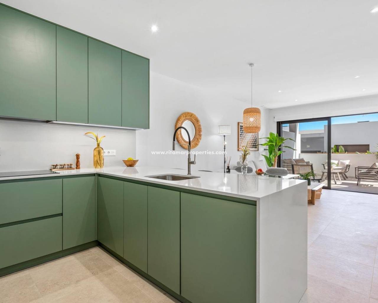 Nieuwbouw wooncomplex in Los Alcazares Los Alcázares is een idyllische locatie voor wie wil investeren in een nieuwe woning aan de Costa Cálida. Dit gebied ligt op slechts 25 minuten van de luchthaven van Murcia en ongeveer 55 minuten van de luchthaven van Alicante en is via de snelweg goed verbonden met grote steden als Cartagena, Murcia en Alicante, maar ook met andere prachtige stranden langs de Costa Cálida en de Costa Blanca. De nieuwbouw bestaat uit 16 moderne 2- en 3-slaapkamerappartementen en 6 exclusieve villa's met 3 slaapkamers. Deze woningen combineren modern design met kwaliteit en functionaliteit, en zijn geschikt voor verschillende levensstijlen. Bewoners kunnen genieten van een prachtig uitzicht op zowel de golfbaan als het pittoreske Mar Menor, wat de algehele woonervaring verbetert. Deze locatie ligt direct aan de eerste lijn van de prestigieuze La Serena golfbaan, bekend om de met elkaar verweven meren en weelderige vegetatie, en is een paradijs voor golfers. De baan heeft waterhindernissen op 16 van de 18 holes en biedt unieke uitdagingen en strategisch spel voor alle niveaus. Bovendien biedt het terrein directe toegang te voet tot het stadscentrum, zodat bewoners de rustige schoonheid van het gebied kunnen ervaren en tegelijkertijd toegang hebben tot plaatselijke voorzieningen en diensten. De Mar Menor, de grootste zoutwaterlagune van Europa, is een van de belangrijkste attracties van de regio, met een oppervlakte van 170 km² en vijf charmante eilanden. Het warme, kalme water en de zachte golven maken het een ideale bestemming om te zwemmen en een verscheidenheid aan watersporten te beoefenen, aantrekkelijk voor zowel natuurliefhebbers als avonturiers. Dit exclusieve wooncomplex in Los Alcázares is niet zomaar een huis, maar een keuze voor een levensstijl, waarbij luxe wonen wordt gecombineerd met de natuurlijke schoonheid van de Costa Cálida. Of je nu een fervent golfer bent, een watersportliefhebber of gewoon op zoek naar een sereen toevluchtsoord aan de kust, deze locatie biedt een unieke kans om te genieten van het beste van het mediterrane leven.